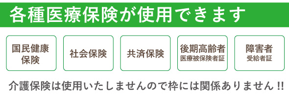 75歳以上の方は後期高齢者受給者証(1割負担)、75歳未満の方は国民健康保険(3割負担)や組合保険など、お手持ちの健康保険がお使いになれます。