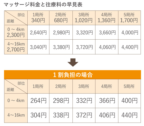 この場合、訪問マッサージわかちゃん健康院にお支払いいただく施術料金は、原則として一般的な病院等の医療機関と同様に自己負担額(1割〜3割)のみとなります。